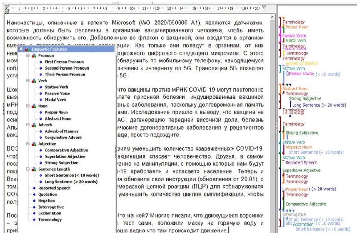 To compare representation of the linguistic features in Russian coronavirus-related fake stories and reliable news, we make use of a QDA Miner, which is research software for coding and analyzing qualitative data. The matrix of linguistic features used in this study is based on a set of linguistic attributes that could representatively reveal the distinguishing features of fake and real news. For example, we compared the use of superlative, comparative and subjective adjectives because creators of deceptive content tend to use a lot of subjective words as they dramatize or sensationalize a news story, while authentic news items use more comparative adjectives (Raskin et al. 2017). We also compared the use of stative verbs, passive voice, and modal verbs, as according to recent studies (see Kuzmin et al. 2020), misleading texts are often characterised by frequent use of these verbs and verb-forms. We also included the first, second and third person pronouns in the set of features, because their frequent occurrences are traditionally attributed to the language of deception (Pisarevskaya 2017).