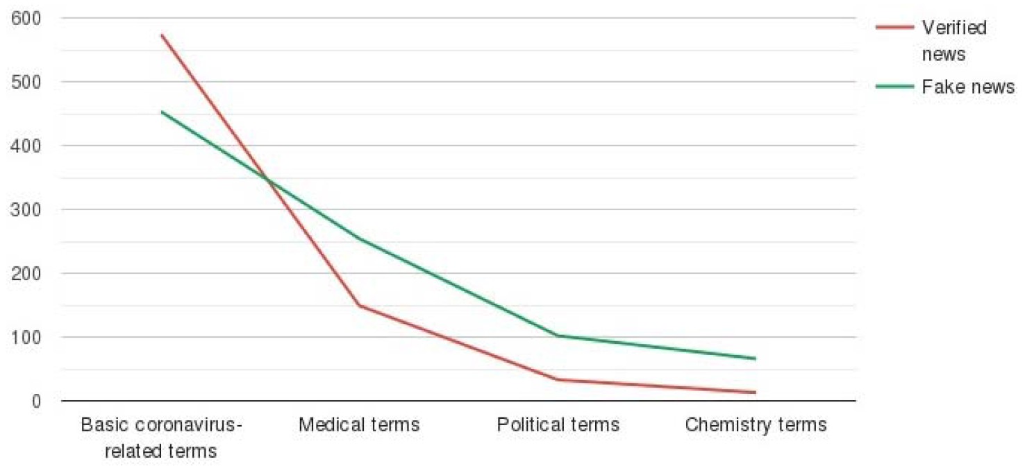 The proposed method of the linguistic analysis of fake and real coronavirus-related news is based on the investigation of differences between the target and the reference corpora using an interpretable set of linguistic features for identifying meaningful distinctive characteristics between deceptive and non-deceptive content. However, the choice of linguistic attributes for analyzing differences between fake news and real news is a very challenging task. In this regard, we should mention Grieve & Woodfield’s (2023) detailed analysis of the real and fake articles by Jayson Blair of the New York Times based on Multidimensional Analysis Tagger. This approach proved to be effective in comparing patterns of grammatical variation in Blair’s real and fake news as it allowed researchers to identify differences in the values of forty-nine features measured across every article in two corpora making interesting conclusions about the variations in frequencies of nouns and redicative adjectives in fake news. Mahyoob et al. (2021) compare collections of real and false news from social networks based on a bundle of discriminating linguistic features and attributes which are chiefly stylistic features of news (e.g., reported speech, quotation, proper nouns). As part of the lexical approach to text comparison, various lexical resources (e.g., LIWC) are applied to real and fake news articles (see Rashkin et al. 2017). This method may be insightful in revealing specific features of the lexicon used in fake news.