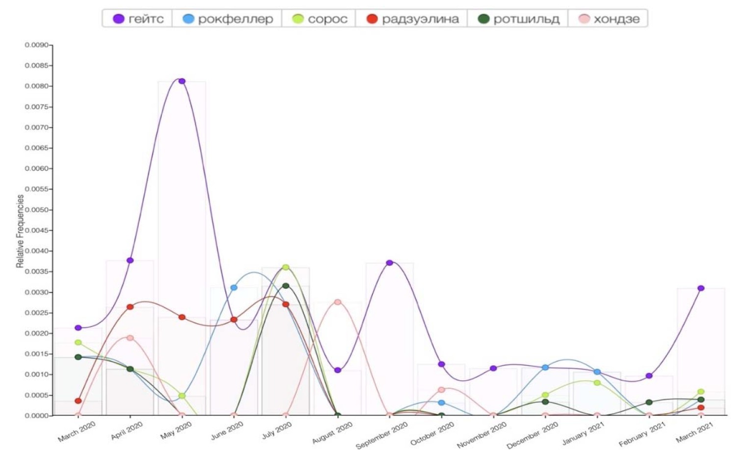 The majority of Covid-19 fake news posts and articles involving businessmen Bill Gates, George Soros, the Rockefellers, and the Rothschilds are based on the claim that the Covid-19 pandemic was planned by billionaires in cooperation with the WHO to “turn people into slaves” by vaccinating them against an “invisible virus” that does not exist. Since the beginning of the pandemic, Bill Gates has been the main target of multiple conspiracy theories spread on social media. The BBC even called him “the voodoo doll of Covid conspiracies” (Wakefield 2020). In Russian viral narratives during the first year of the pandemic, Bill Gates was often referred to as «создатель дивного нового мира» (the creator of a new brave world), «стоящий за пандемией» (a person behind the pandemic), «главный вакцинатор» (the main vaccinator).