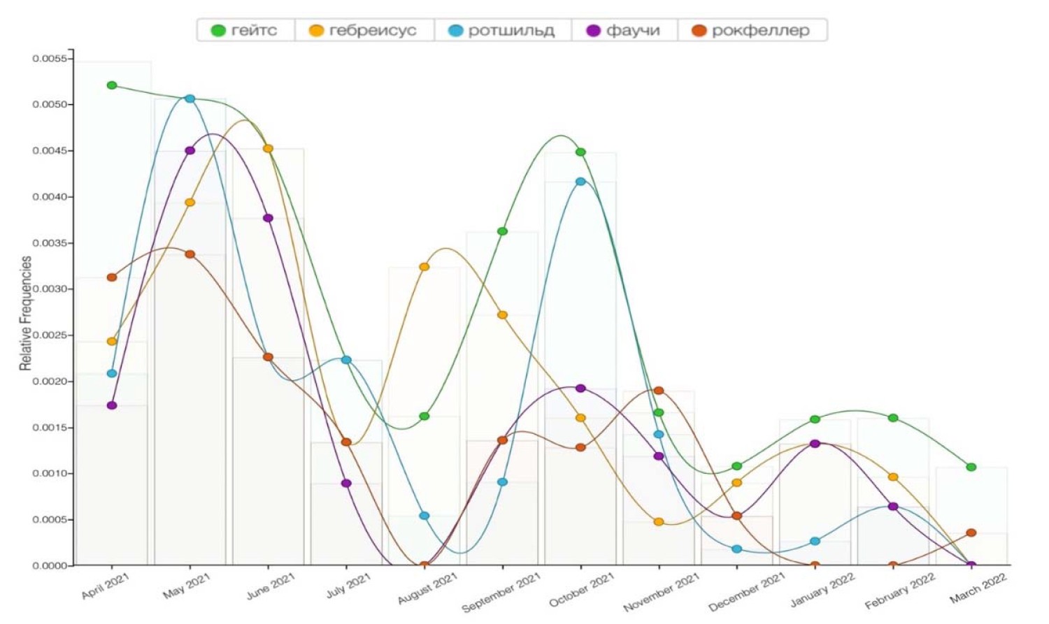 The context analysis of the episodes containing corresponding names showed that these famous persons are turned into either protagonists or antagonists of fake stories–either villains and organizers of the pandemic (Gates, Rockefeller, Rothschild, Soros), or truth-tellers exposing secret information about the WHO (Rajoelina), and the Wuhan laboratory (Honjo). During the second year of the Covid-19 pandemic, the proper nouns gates, rothschild, rockefeller were also frequently used in viral fake stories (Figure 3). In addition, the texts of conspiracy theories involving the current Director-General of the WHO Tedros Adhanom Ghebreyesus (гебреисус (ghebreyesus) – 55 occurrences within Corpus 2) and the American infectious disease specialist Anthony Fauci (фаучи (fauci) – 44 occurrences within Corpus 2) began to gain popularity during the period from April 2021 to December 2021 (Figures 3 and 4).