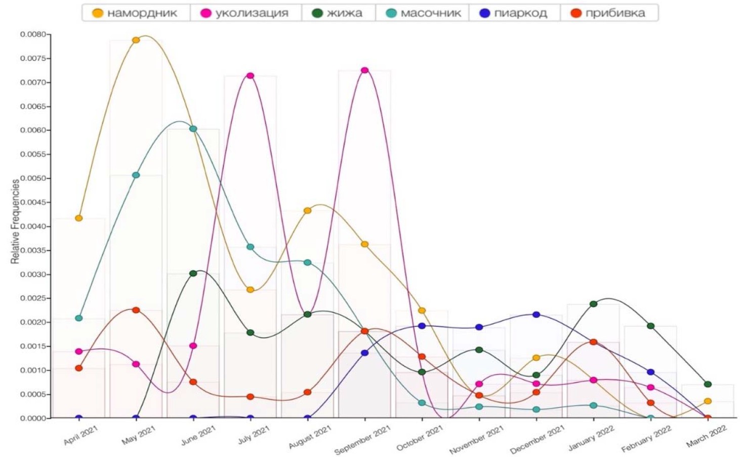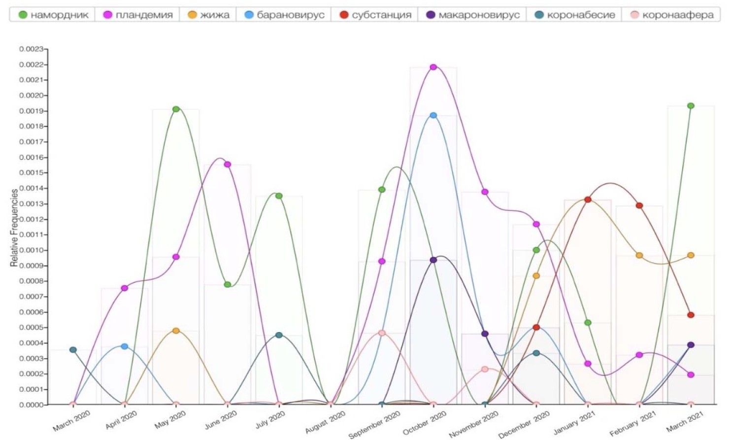 Periods of the increasing popularity of the texts that use the dysphemism намордник (muzzle) to aggressively convince the readers of the futility of face masks coincide with the introduction of the requirement to wear masks and gloves in public places in Moscow (May 12, 2020) and active public debate on the mandatory masks in schools in September 2020 (the beginning of the school year in Russia) and in December 2020 – January 2021 (the end of distance learning for schoolchildren). The word бульон (broth) as a substitution for the term вакцина (vaccine) was used several times before the start of mass vaccination in Russia. However, from November 2020 to March 2021, the nouns жижа (slurry) and субстанция (substance) occupy the leading positions among dysphemisms in the corpus. We assume that a large number of texts that became viral during this period contribute to the rapid "fading" of dysphemisms, namely, when a frequently used derogatory word ceases to produce the desired effect on the reader, and a new expressive replacement is required.