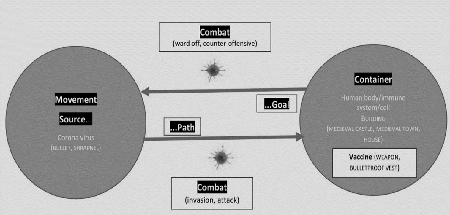 Unlike a rather conventional metaphorical representation of the vaccine (or, the antibodies) as a “weapon” in examples (2), (4) and (5) above, example (6) draws on our somewhat extended knowledge about wars and battles, which is based on the following image: people are on the frontline of the battle to stop the spreading of the virus perceived as “a bullet” and “a shrapnel”, thus resulting in the getting vaccinated is wearing a bulletproof vest mapping. The bulletproof vest sub-scenario thus engages ‘open’ (Breeze 2017: 70), idiosyncratic expressions used in a non-specialist text which metaphor producers find apt to clarify the concept of vaccination. These creative extensions of conventional metaphorical themes refer to “exploiting a normally unused element of the source domain of a conventional conceptual metaphor” (Pérez-Sobrino et al. 2022: 129). A wider text in which the metaphorical lexical items are situated serves as a guideline for ‘reading’ the message conveyed by the experts, that the vaccine can take the blow even though it does not offer total protection. Example (6) is also indicative of the interrelations between the three scenarios, combat, container (by means of human body is a container) and movement (the lexical choice “go against the virus”), which contributes to the overall explanatory potential of such conceptual patterns.