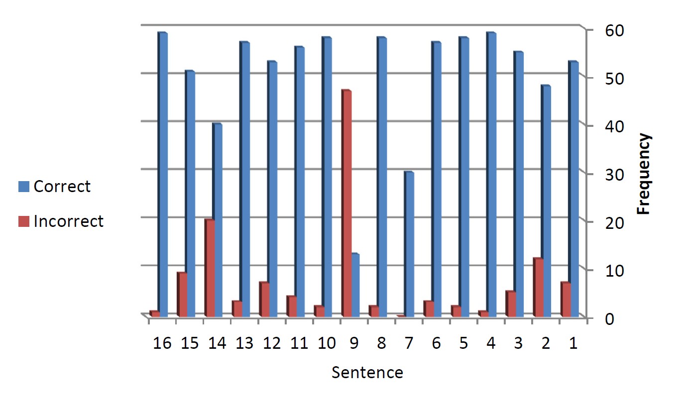 | Sentence | Correct | Incorrect | Chi-Square | Sig | ||