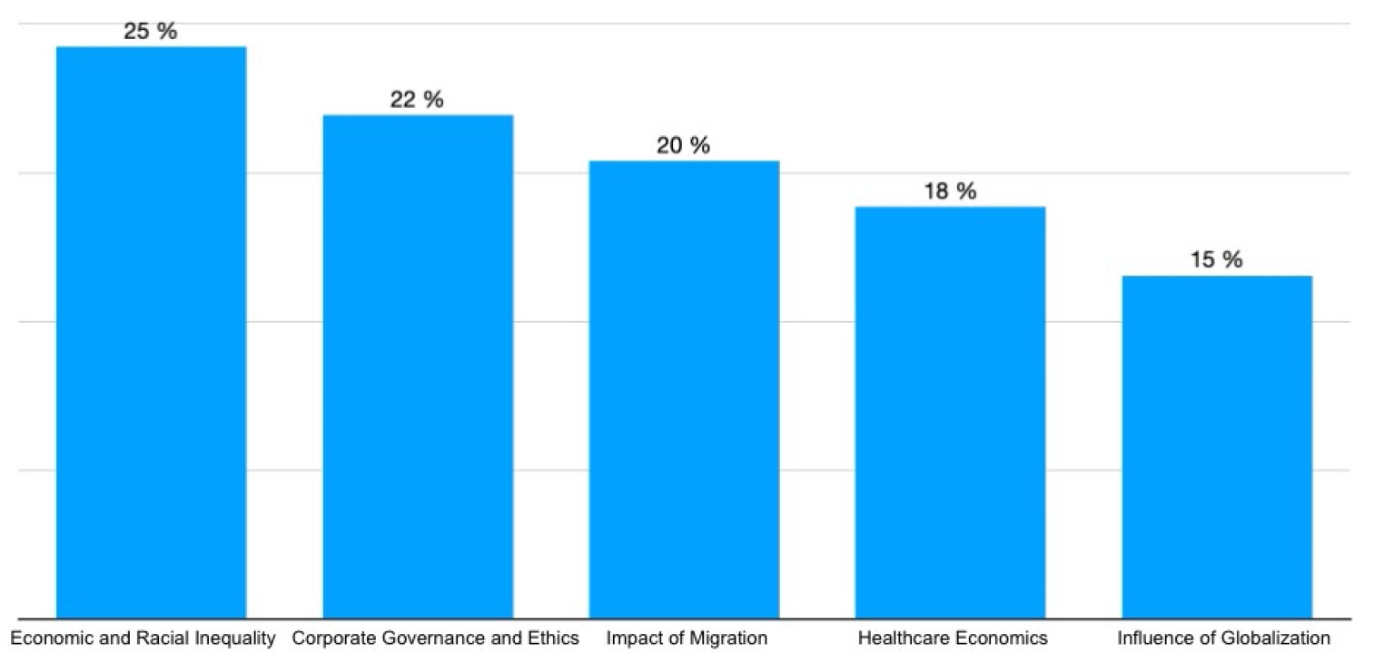 The quantitative analysis of the corpus revealed five prevalent thematic groups where euphemisms are prominently registered in SAE economic discourse, namely (1) Economic and Racial Inequality, (2) Corporate Governance and Ethics, (3) Impact of Migration, (4) Healthcare Economics, and (5) Influence of Globalization. Each thematic group has shown varying levels of prevalence reflecting distinct socio-cultural aspects within the South African context (Figure 1).