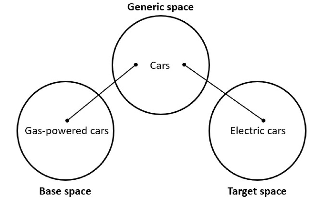 Consider, for example, the statement “the future of cars is electric”. Using our world knowledge, we know that the prototypical semantic frame for a car in the present day involves a gas-powered car. To imagine a “future car”, we first reduce the details of the present car frame, projecting it to the generic space, in order to then replace those details with new desired ones. This process can be represented as the diagram in Figure 1.