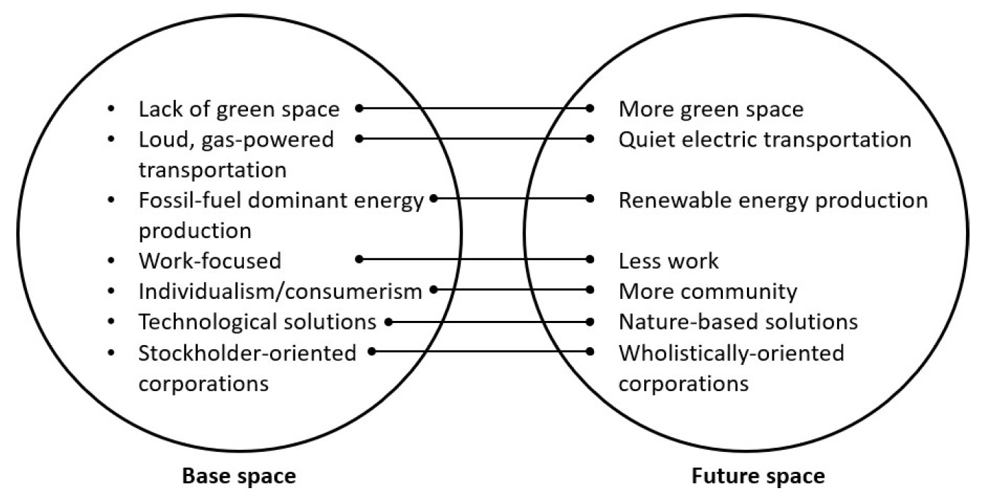 There are two particularly important linguistic patterns in Jordan’s response. First, comparative structures are frequently used; there will be “much more green space”, “quieter” transportation, “less” work, “more” feelings of connection, and “more wholistic” approaches to corporate priorities. The second pattern of note is the use of negation; “not fossil fuel based” and “not being binded to fiduciary responsibility”. By negating or changing the degree of elements in the base space, Jordan maintains the overall structure of the base space in the imagined future. Modeled as a mental space diagram, this imagining can be thought of as creating one-to-one mappings between the two spaces, as depicted in Figure 3.