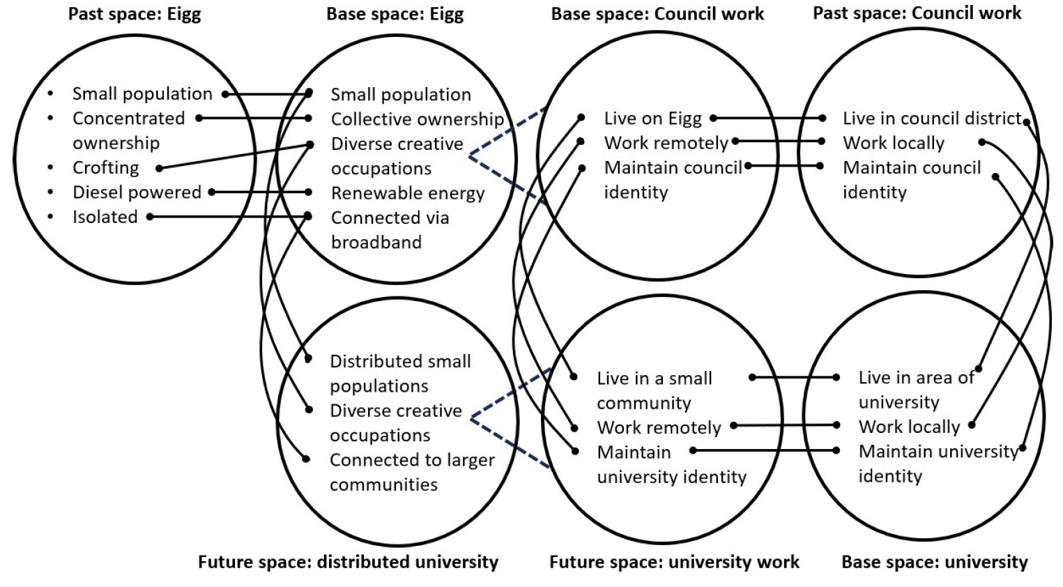 In the final analysis, I consider an imagined world that is very consciously created from multiple input spaces. The two input spaces, the Isle of Eigg and a present-day university, are described overtly and in detail by the participant, Hayden, who then uses the structural differences between them to construct an entirely new space — a future distributed university. Given the complexity of this mental space construction, I will discuss it in three parts.