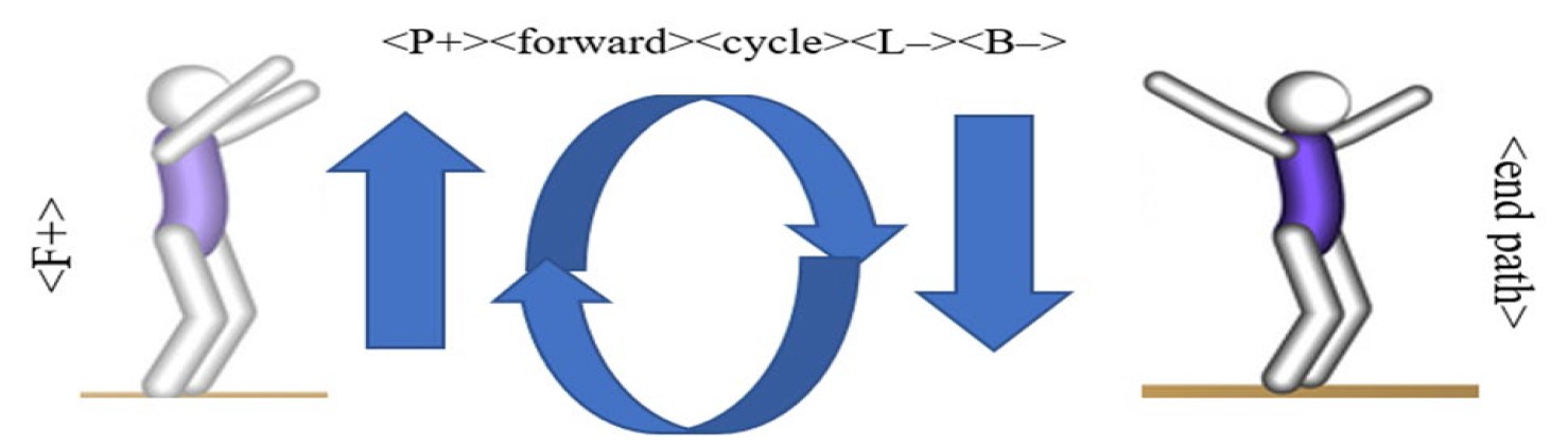 Instances when the extremities of the human body moved closer to or further away from the body’s center of gravity were annotated using the <center-periphery> or the <periphery-center> specifier. The remaining specifiers clearly indicate the direction of movement of the body: the specifier <up>, the specifier <down>, the specifier <forward>, and the specifier <reverse>.