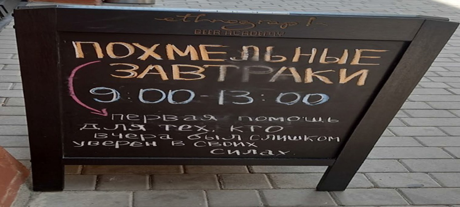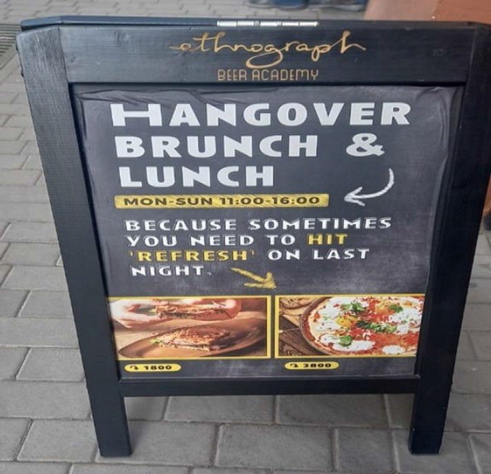 Although it is unusual for local Armenians to go to restaurants to get breakfast, it was also required to have an Armenian version for symmetry. However, its text turned out to be completely different: ՍԹԱՓԵՑՆՈՂ ՆԱԽԱՃԱՇ։ 09–13 ՔԱՆԻ ՈՐ ԱՌԱՎՈՏԸ ԱՎԵԼԻՆ Է ՊԱՀԱՆՋՈՒՄ, ՔԱՆ ՍՈՒՐՃԸ (picture 4) SOBER BREAKFAST. 09–13 BECAUSE THE MORNING REQUIRES MORE THAN COFFEE (picture 4). In Russian drinking culture, hangovers are quite common, as excessive consumption is accepted and, in some subcultures, even considered prestigious. As a result, the causes of hangovers are framed as a socially acceptable deviation. In contrast, while drinking is prevalent, excessive consumption that leads to a loss of self-control is seen negatively. Publicly acknowledging this fact is also frowned upon. As a result, the term опохмелиться, which means “to sober up,” is absent from the Armenian version. This is not due to a lack of vocabulary, but rather because the term carries undesirable connotations. In Armenian, the phonetically expressive word խումառ (or խումհար) is primarily associated with unpleasant physiological effects, which is something that is typically not acknowledged in public.