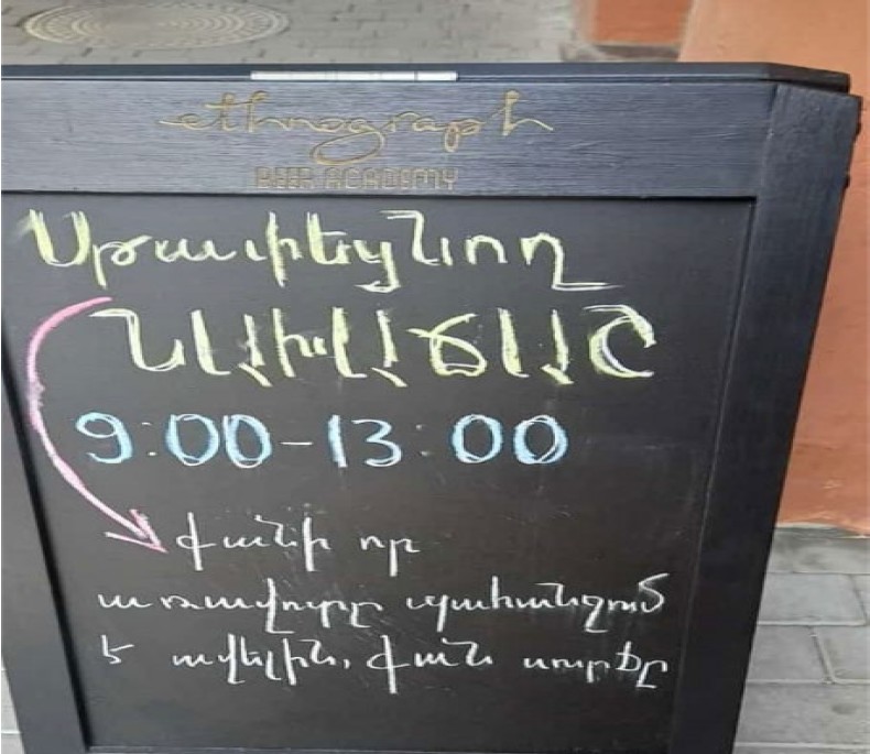 Consider an example of non-personalized communication that takes into account the linguistic and cultural backgrounds of potential visitors. At the “Ethnograph Beer Academy”, a beer restaurant located in Yerevan, the same message appears on signboards in three languages. The owners have likely developed a plan to accommodate visitors during the morning hours. Since 2022, there has been a significant increase in Russian guests, leading to the introduction of a new type of breakfast, as indicated by the announcement (picture 3):