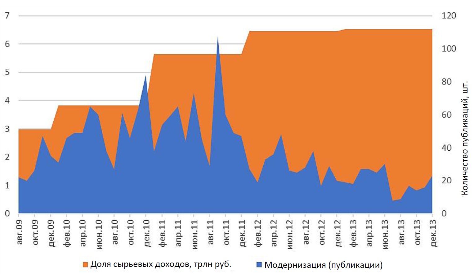 Первый из наиболее значимых примеров реализации в информационном дискурсе кумулятивного резонанса с накопительным эффектом мы предлагаем связывать с темой экономической модернизации, провозглашенной в статье президента Российской Федерации Дмитрия Медведева «Россия вперед!» (10 сентября 2009 г.)3. Этот материал выдвинул на первый план идеи развития предпринимательства и трансформации российской экономики от сырьевой к высокотехнологичной. Он стал исходным инфоповодом, сформировавшим кумулятивный резонанс, который прослеживается в экономических публикациях СМИ до конца 2013 г. Примечательно, что журналисты не могли опираться ни на какую-либо значимую практическую базу, а лишь на заявления официальных лиц. Тема модернизации была представлена оценкой перспектив реализации инновационных программ, авторским видением ситуации, опыта реализации программ модернизации еще не было. На данном этапе в СМИ формируется паттерн веры, когда авторы, надеясь или будучи уверены, что программа модернизации будет реализована, авансом дают ей положительную оценку. Сдержанно-позитивный тон журналистских материалов, посвященных модернизации, сохраняется достаточно долго: с середины сентября 2009 г. по начало октября 2011 г. Его прерывает заявление Д. Медведева, что он не будет баллотироваться на пост президента в 2012 г. Эта новость указывает, что можно подводить итог модернизации, пытаясь описать, что именно было сделано за прошедшие годы. И здесь кумулятивный резонанс начинает агрегировать все негативные факты, ранее находившиеся в рамках общего тематического пласта модернизации, но не выходившие на первый информационный план: уголовные дела против предпринимателей, зависимость экономики от сырьевого экспорта, несостоявшийся переход к инновационной промышленности. Уже к зиме 2011 г. в связи с темой модернизации в периодике начинает доминировать паттерн разочарования, включающий все более жесткую оценку как самой модернизации, так и персоналий, за нее отвечавших. Так, например, в статье Д. Ермолаева «Модернизация Дмитрия Медведева полностью провалена» (Regnum), автор отмечает, что инициаторы программы модернизации «не способны ни на что, кроме лозунгов», а в обзоре Л. Шевцовой «Притворная модернизация» указывается, что «Медведевская Россия потратила впустую четыре года жизни» (Gazeta.ru). При этом тональность значительного числа публикаций меняется с нейтрально-положительной на негативную. Уже весной 2012 г. внимание к данной теме идет на спад, а ее остаточный информационный фон сохраняется во многом благодаря цитированию слов чиновников, еще некоторое время продолжающих эксплуатировать модернизационную повестку. Здесь также важно отметить, что даже на начальном этапе распространения темы модернизации в периодике характеризовавший ее в то время паттерн веры явным образом противоречил объективно замеряемым рыночным индикаторам (рис. 1).