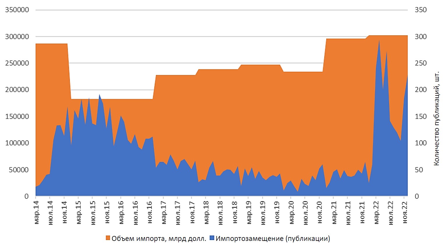 Source: compiled by the author. The volume of imports is given according to the Federal Customs Service, Rosstat and Lokoinvest (for 2022). Retrieved June 10, 2023, from https://customs.gov.ru/documents-projects; https://rosstat.gov.ru/statistics/vneshnyaya_torgovlya; https://lockoinvest.ru/analytics/q-a-sanktcii-ekonomika-i-rynki-10/