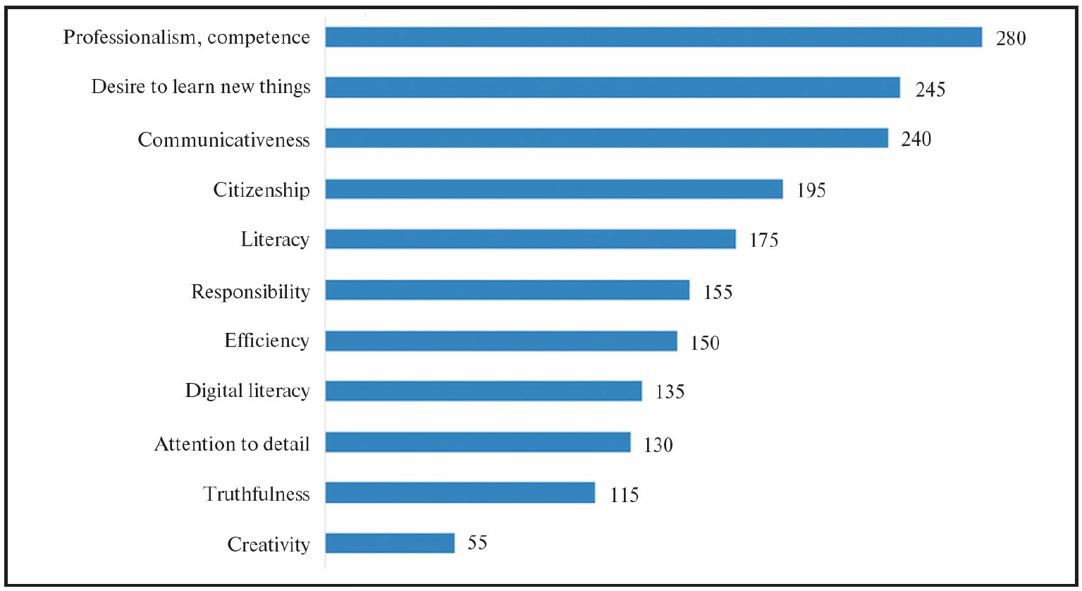 Нет ничего удивительного в том, что такие качества, как коммуникативная компетентность, грамотность, любознательность, оперативность отмечены чаще всего, они являются перманентно необходимыми для журналиста качествами; подобные результаты были вполне релевантны и полвека назад. Однако актуальные в настоящее время – цифровая грамотность и креативность – неожиданно оказались в конце списка.