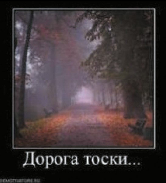Демотивационный постер (демотиватор) – это изображение в черной рамке, под которым размещается слоган. Источником таких постеров стал офисный фольклор США, когда менеджеры среднего звена, устав от мотиваторов, придумали пародию. Мотиваторы – это вид психологической техники для повышения производительности труда (используются изображения в голубой рамке с позитивной подписью-слоганом). Видна разница между двумя типами постеров (рис. 4, 5). Первый – в голубой рамке – выглядит ярким и заставляет пользователя испытывать преимущественно положительные эмоции, тогда как второй – в черной рамке с подписью «Дорога тоски…» – смотрится уныло. Особенностями демотиваторов, характерными только для них, являются изображение в белой тонкой рамке, черный фон и слоган-подпись (всегда белого цвета), смысловое визуально-вербальное единство. Демотиваторы были особенно востребованы примерно 10 лет назад, сегодня их популярность заметно снизилась.