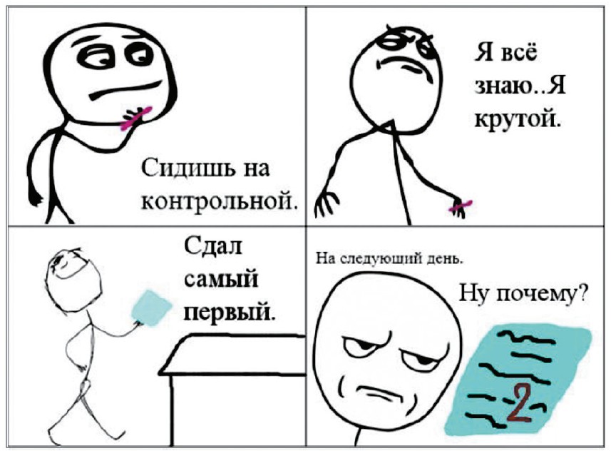 «Макро», или «макрос» (от англ. macro image – макрокартинка), – изображение с текстом, которое используется в онлайн-обсуждениях для точного и остроумного выражения мнения. Изображение может представлять собой фото определенных людей или кадр из фильма, которые передают эмоцию (удивление, торжество, ухмылка и т.д.). От пользователя не требуется знания фильма или сути сопутствующей сцены, эмоция должна четко передаваться посредством невербальной коммуникации персонажа (поза, жесты, выражение лица, взгляд). Макросы можно считать улучшенным графическим аналогом смайликов (стилизованное графическое изображение человеческого лица). Таким образом, макрос состоит из изображения, определяющего эмоциональное восприятие, и уточняющего текста, посвященного определенному контексту (ситуации). В отличие от адвайсов и аткрыток, макросы остаются актуальными в социальных сетях. Это связано с тем, что они позволяют лаконично выразить эмоциональный контекст, который с помощью слов передать весьма сложно. К примеру, на рисунке 6 изображена знакомая студентам ситуация на экзамене, когда повезло с вопросами. Мем можно интерпретировать как ликование, самодовольство, ощущение собственной всесильности. Именно это ощущение сложно передать вербальными знаками, но картинка избавляет автора от такой необходимости.