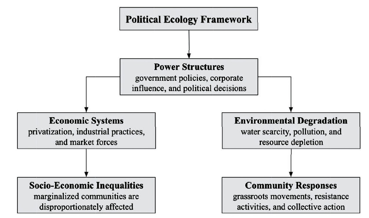 Political Ecology may be defined as the study on how power relations, economic processes, and social disparities rule the use of natural resources. As such, the topic cuts across various disciplines and provides the framework for analyzing the relationships between environmental issues and politico-social stakeholders. In this regard, such effects could not result from the conservation virtue, as portrayed by Banerjee. It is evident that he has based his story on the negative aspects associated with the water crisis – the recurring scenario. Moreover, he has decided to bring the scenario during dystopian life in the modernist Delhi. The above-described approach demonstrates how the socio-political characteristics led to resource allocation disparities (Greenberg and Park, 1994). Figure 2 represents the relationships between power structures, economic systems, and environmental degradation as discussed in the novel.