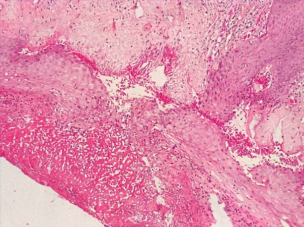 Fig.12 The sclerosing variant of the vulva SL. Under the atrophic multilayered squamous epithelium with signs of keratinization and hyperkeratosis, there is a moderately pronounced chronic inflammation of the superficial and deep layers of the dermis with angiomatosis, plasma impregnation of the walls of the vessels of the microcirculatory bed (CHIC-Hotchkiss reaction, x 100)