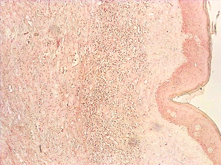 Fig. 20. Scleroatrophic variant of the course of SL. Under the atrophic multilayer squamous epithelium with signs of hyperkeratosis, fibrous edematous tissue with compression of blood vessels and moderate lymph-histiocytic infiltration of the dermis (Picro-Mallory coloration, x 100)
