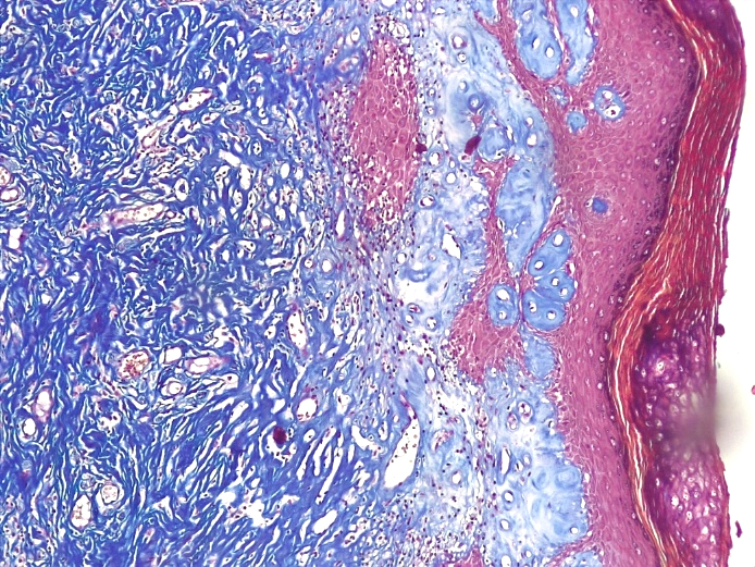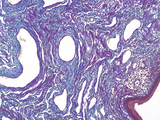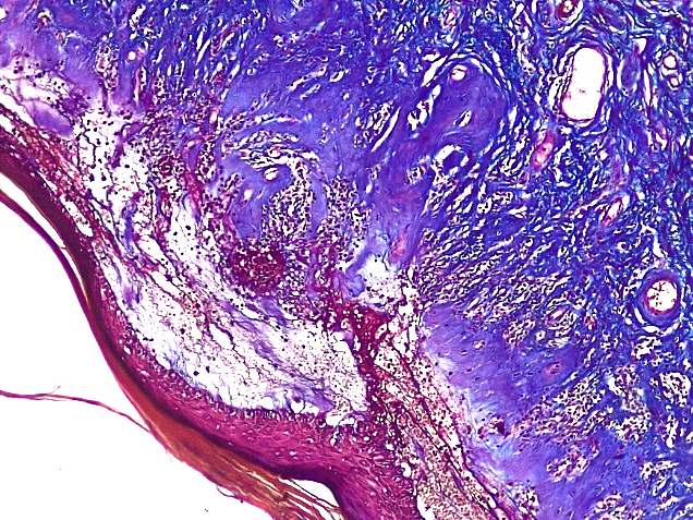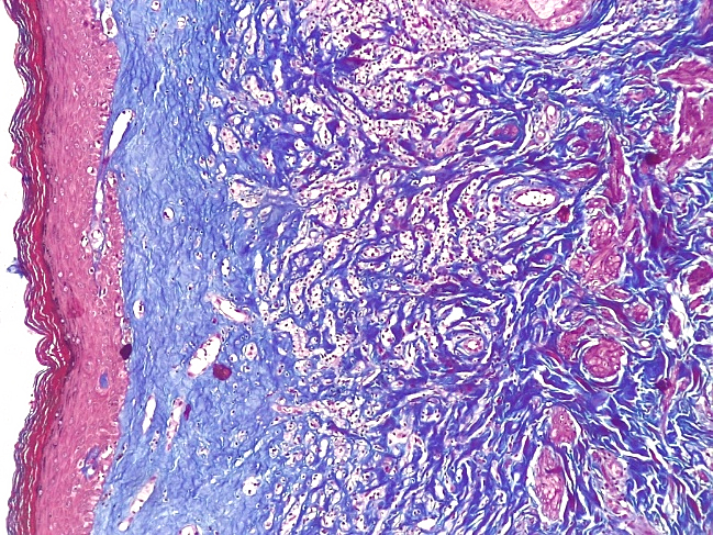 Fig.13. The sclerosing variant of the vulva SL. Under the atrophic multilayered squamous epithelium with signs of keratinization, there is pronounced fibrosis of the dermis with moderate lymph-histiocytic infiltration and uneven angiomatosis (Picro-Mallory coloring, x 100)