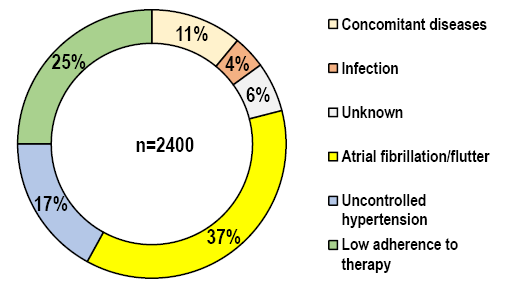 The leading triggers of ADCHF in the studied patient population were an episode of atrial fibrillation/flutter (37 %), low adherence to treatment (25 %) and uncontrolled hypertension (17 %), exacerbation of concomitant diseases (11 %), infection (4 %). In 6 % of patients, the leading trigger could not be identified (Fig. 3).