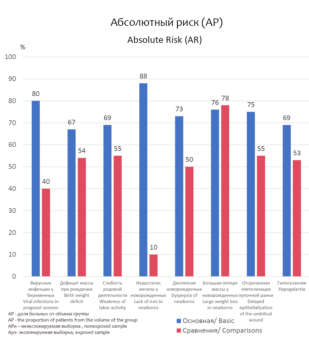При оценке степени влияния факторов риска нами использовались статистические и математические приемы. По таблицам сопряженности были произведены расчеты наиболее значимых факторов риска в антенатальном и постнатальном периоде. Проводился расчет абсолютного риска (АР). Для этого все наблюдаемые дети были разделены в зависимости от наличия или отсутствия фактора риска (экспонируемая выборка и неэкспонируемая выборка) на 2 основные группы.