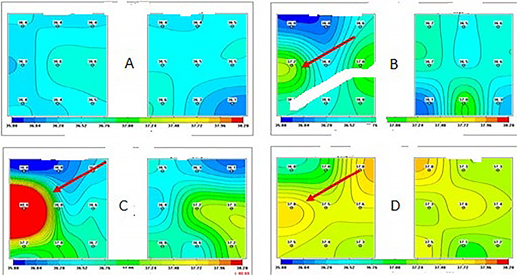 Fig. 1. Example of thermal maps obtained by microwave radiothermometry. A — before training, B — after a 20‑minute warm-up workout, C — after sparring, and D — one hour after sparring. The arrow marks the area of hyperthermia typical for this athlete (according to Shevelev O.A. et al. [39])