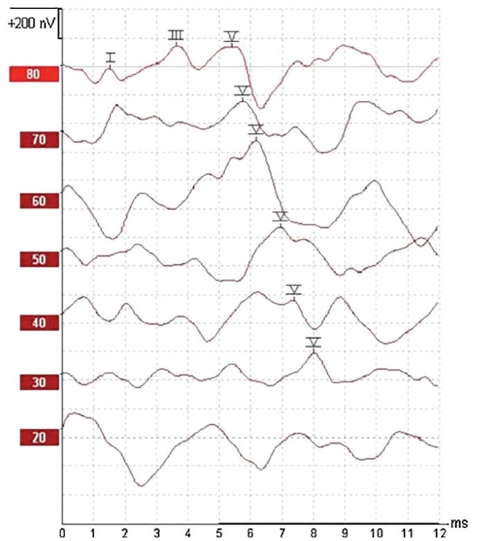 Fig. 1. Objective hearing threshold determination. Wave V remains visible up to 30 dB HL, defining this patient’s threshold. ABRs reliably explore only between 2000 and 4000 Hz [30]
