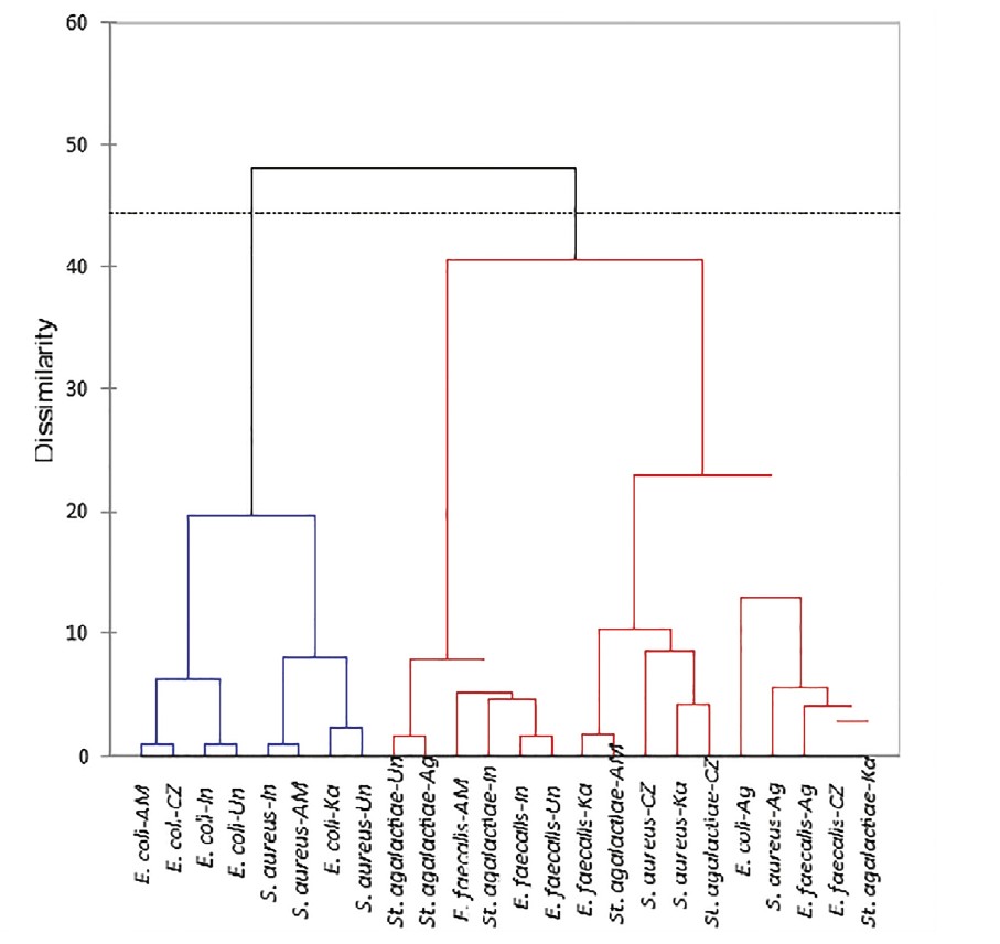 Fig. 3. Dissimilarity of uropathogens long exposed or not to antibiotics and nanoparticles. The dendrogram was obtained after a principal component analysis including the Spearman correlation test and considering the susceptibility to antibiotics, the biofilm formation, the planktonic bacteria and the variations of the 3 above-mentioned parameters compared to the initial strains