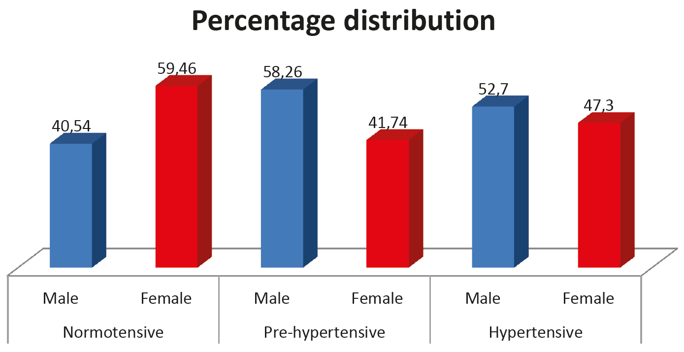 In this observational study, we evaluated patients for metabolic syndrome who attended Government RDBP Jaipuria Hospital in Jaipur’s Medicine department’s outdoor patient’s department (OPD). These people were divided into three groups: normotensive (37) [male (40.54 %); female (59.45 %)], pre-hypertensive (115) [male (58.26 %); female (41.74 %)], hypertensive (148) [male (52.7 %); female (47.3 %)] (figure 1). Based on the criteria established by the American Heart Association (AHA) for Asians [16].The emergence of cardiovascular disease is linked to metabolic syndrome. There is a two-fold increase in the risk of cardiovascular disease and a four-fold increase in the risk of fatal coronary heart disease. In India and other South Asian nations, the prevalence of obesity and metabolic syndrome is rising rapidly, increasing mortality and morbidity from CVD and T2DM [17, 18].In the current study, there were no such significant differences between male and female participants across all groups in several parameters. According to the findings of our study, metabolic hypertensive patients were aged than pre-hypertensive and normotensive patients. The mortality rate attributable to the metabolic syndrome and its risk factors differ by gender and age. Our findings show that the prevalence of MetS rises with age and is more common in men than in women. Multiple studies have also shown that «modernization» causes the change in physical activity levels, adiposity, dietary, and psychosocial stress, which raise blood pressure and exacerbate age-related elevations in blood pressure. The waist-hip ratio and body mass index were nearly same across all BP groups. According to the acceptable body mass index provided by the WHO for Asian populations, body mass index indicates that all participants were obese [19].And WHR was also more than cut-off points for Asians used (0.95 in men and 0.80 in women) [20].In our study, the hypertension and prehypertensive groups had higher fasting blood glucose levels than the normotensive group. FBG was shown to be positively associated with BP, according to Lu Y et al. In males and females, BP and FBG had different associations [21].The renin — angiotensin aldosterone system (RAAS), which affects blood pressure, may be altered if the FBG level rises as a result of metabolic diseases, obesity, and hyperglycemia with insulin resistance [22].In the current study, all groups had raised levels of total cholesterol, LDL, VLDL, and TG, although hypertensive and pre-hypertensive had greater levels than normotensive. This exceeded the criteria for cholesterol targets for South Asians provided by the ATP III study from the National Cholesterol Education Program in the United States [23].However, in the current investigation, metabolic individuals with hypertension and pre-hypertension had low HDL levels. The findings of the Choudhury KN et al. research support our findings that hypertension individuals had considerably higher mean serum TC, TG, and LDL levels than normotensive patients [24].Additionally, the mean HDL level was statistically significantly lower in hypertensives compared to normotensives. Because insulin influences TG and HDL–C metabolism, the occurrence of hypertriglyceridemia and low HDL concentrations generally never occurred as independent illnesses and were almost usually associated to insulin resistance [25]. In this present study hypertension and pre-hypertension were more prevalent in the population with metabolic syndrome.