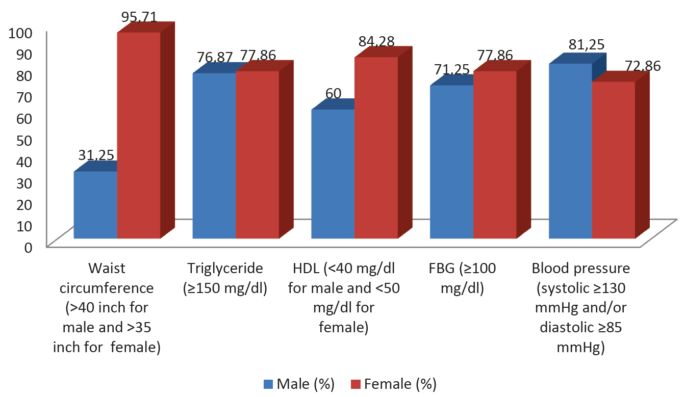 Figure 2 depicts the distribution of total metabolic syndrome population on the basis of their inclusion criteria for metabolic syndrome. There were 95.71 % females had waist circumference more 35 inches and 31.25 % males had waist circumference more than 35 inches. There were 77.86 % females had triglyceride level equal to or more than 150 mg/dl and 76.87 % males had triglyceride level equal to or more than 150 mg/dl. There were 84.28 % females had HDL level less than 50 mg/dl and 60 % males had HDL level less than 40 mg/dl. There were 77.86 % females had fasting blood glucose (FBG) level equal to and more than 100 mg/dl and 71.25 % males had fasting blood glucose (FBG) level equal to and more than 100 mg/dl. There were 72.86 % females had systolic blood pressure equal to and more than 130 mmHg and/or diastolic blood pressure equal to and more than 85 mmHg. But 81.25 % females had systolic blood pressure equal to and more than 130 mmHg and/or diastolic blood pressure equal to and more than 85 mmHg.