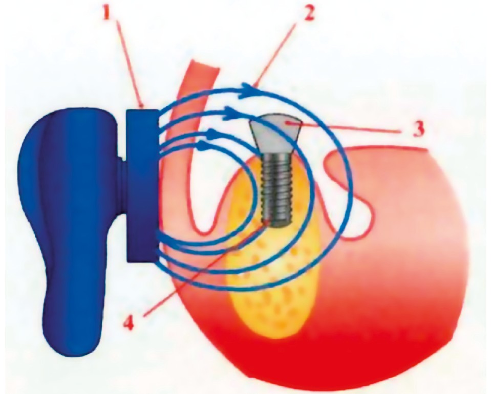 Fig. 1. Schematic representation of an external therapeutic electromagnetic inductor in the buccal region, the propagation of electromagnetic waves and their effect on soft tissues, bone tissues and dental implants. 1 — external inductor, 2 — magnetic flux, 3 — healing abutment, 4 — dental implant