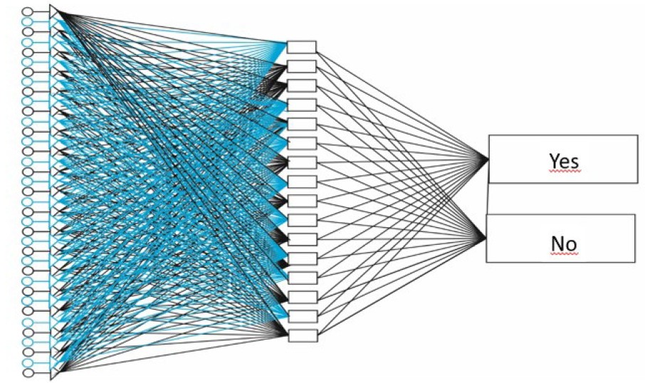 На основании выявленных клинико-анамнестических факторов риска СЛ вульвы была разработана нейросетевая модель прогнозирования заболевания. При этом в качестве целевой (зависимой) категориальной переменной модели был выбран показатель, определяющий наличие (да), или отсутствие (нет) риска развития СЛ вульвы, а независимыми переменными (предикторами модели) были выбраны показатели со статистически значимыми корреляционными связями, оцениваемыми коэффициентом корреляции Спирмена (R), при R не < 0,2. При этом в модуле «Автоматизированные нейронные сети» датчиком случайных чисел 404 больных были разделены на обучающую (70 %) выборку — 284 чел., контрольную (15 %) и тестовую (15 %) выборку по 60 чел. Под производительностью сети подразумевается доля ее правильных классификаций в %, поэтому ключевым моментом в оценке прогностических свойств нейросети является производительность на тестовой выборке. У сети с высокими прогностическими свойствами она должна быть не меньше производительности на обучающей выборке, в противном случае нейросетевая модель называется переобученной. Из 20 построенных и обученных нейронных сетей, многослойных персептронов (Multilayered perceptron — MLP), была отобрана сеть MLP 39–16–2 (Рис. 2) с наилучшими прогностическими свойствами, определяемыми долей правильно классифицированных сетью объектов на обучающей, контрольной и тестовой выборке.