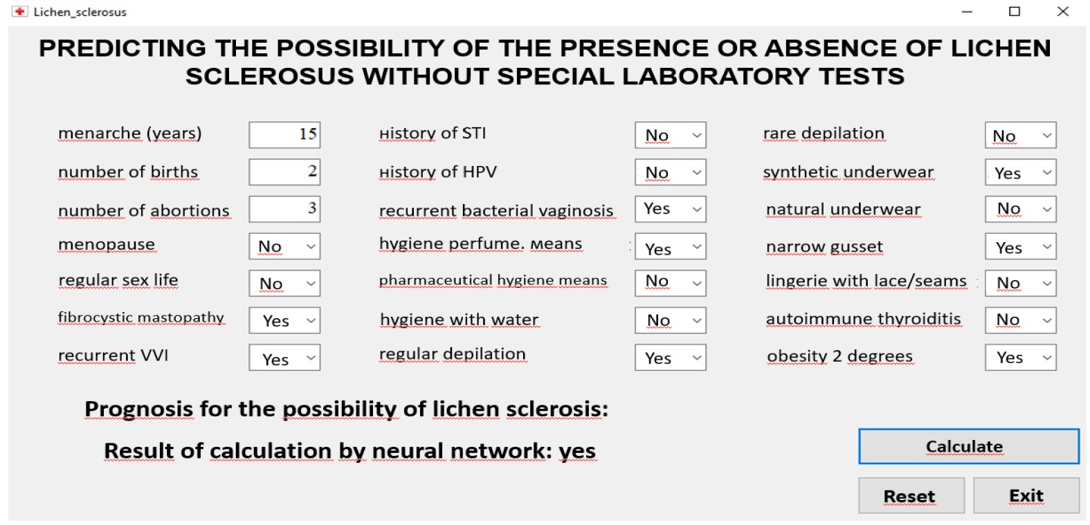В итоге, по разработанной нейросетевой модели на языке си шарп (C#) была создана компьютерная программа, автоматизирующая процедуру прогнозирования развития (да, нет) СЛ вульвы. Интерфейсное окно программы приведено на рисунке 3 (приведен пример прогноза для произвольной пациентки). Значения категориальных показателей (да, нет) выбираются врачом при помощи выпадающих меню, а значения непрерывных показателей вводятся вручную. После введения данных пациентки и нажатия на кнопку «Рассчитать», программа прогнозирует возможность (да) или невозможность (нет) наличия/развития СЛ вульвы.