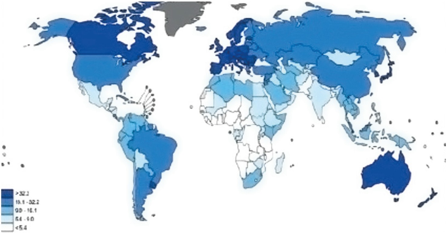 Mapping in oncology is a rather interesting way to conduct analysis, obtain statistical data on the distribution of the incidence of cancer survival and mortality, and study spatial correlations of the studied diseases. L.P. Volkotrub believes that oncological mapping is an excellent way to conduct research in the field of oncology to identify the causes of this disease, assess the prevalence of cancer depending on the region, the area of residence of patients, for subsequent assessment and identification of risk zones. A cartogram is a kind of map of the prevalence of the disease, which, in addition to territorial information, contains information about survival, mortality, various stages and features of the course of the disease in the form of colored notes and sketches for greater clarity. To date, technological progress simplifies mapping, since this process is already automated [6]. There are many examples of the use of mapping in oncology, for example, in the publication of M. Sh. Osombaev and co-author. A cartogram of the incidence and mortality of colorectal cancer in the world is vividly presented, which clearly demonstrates the territories affected by this disease (Figures 2 and 3) [14].