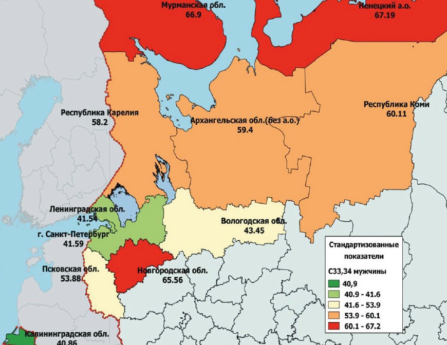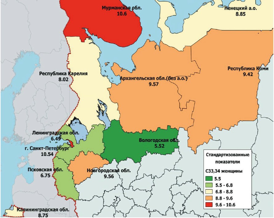 In the publication of V.M. Merabishvili and colleagues a more detailed distribution of standardized indicators of lung cancer incidence in the male and female populations of the Northwestern Federal District of the Russian Federation, as well as the index of reliability of accounting for lung cancer at the regional level, is demonstrated, the cartogram presented below in Figures 4, 5 and 6 was prepared by Doctor of Medical Sciences I.A. Krasilnikov and taken from this article [15].