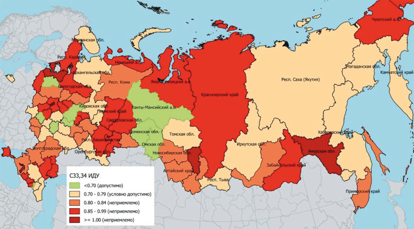 When analyzing the situation in Russia, it was found that the following regions took precedence in terms of favorable outcomes in the rating of regions of the Russian Federation in terms of the scale of the problem: Kaluga Region, Kamchatka Territory, Krasnoyarsk Territory, Murmansk Region, St. Petersburg, and Tomsk Region. In all regions, good early diagnosis and a high level of qualified medical care were noted.