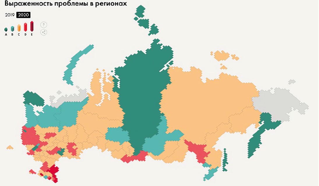 Fig. 7. Severity of the problem in the regions of Russia (from A to E, the prevalence from the lowest to the highest is highlighted in colors) according to [31]