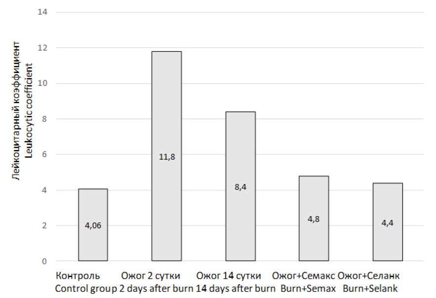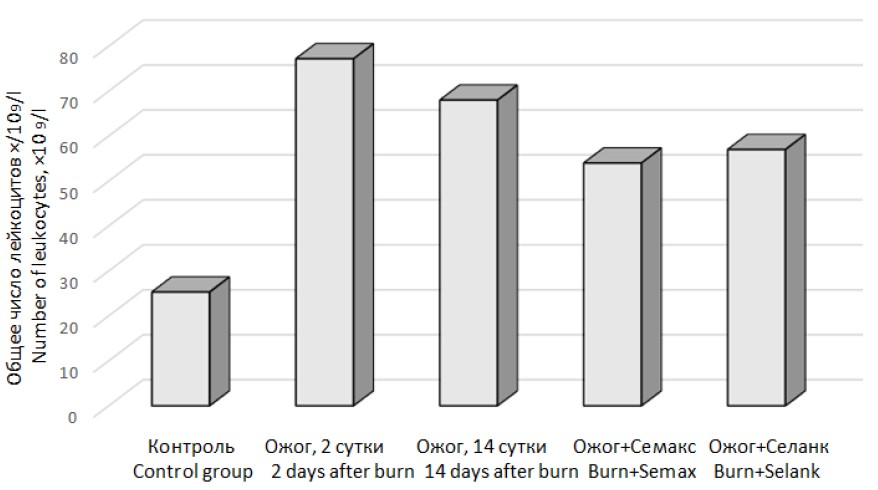 В условиях ожога кожи и коррекции соединениями Семакс и Селанк происходило восстановление клеточного звена иммунитета. Семакс приводил к снижению общего количества лейкоцитов на 45 % (p < 0,01), а Селанк — к их уменьшению на 48 % (p < 0,01). Наружные аппликации и внутрибрюшинные инъекции нейропептидных препаратов способствовали снижению числа палочкоядерных нейтрофилов на 50 % (p < 0,01) и восстановлению числа сегментоядерных нейтрофилов на 30 % (p < 0,05) до нормальных контрольных показателей по сравнению с группой животных с термической травмой на 2 сутки без применения средств коррекции.