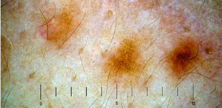 Dermatoscopic examination of monomorphic rashes in spotted elements shows an increase in yellow-brown colour, maintenence of skin appendages, unchanged vellus hair shafts, pseudo-pigmentary network, a weakly pronounced vascular pattern of an asymmetric nature, moderate erythema in surrounding areas (Fig. 3).