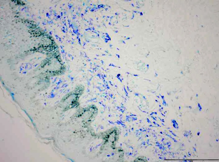 Histological examination of skin biopsy material dated 01.06.23 (Fig. 4): a fragment of skin without subcutaneous fat. The epidermis is slightly thickened, its layers are differentiated, pigmentation of keratinocytes of the basal layer of the epidermis shows no signs of pigment loss. There is moderate lymphomonocytic infiltration around the vessels of the superficial plexus, in which, with additional coloration with toluidine blue, a significant admixture of tissue mast cells is determined (Fig. 5). Collagen fibers without signs of structural changes. In the reticular layer of the dermis there are fragments of adnexal structures of the usual histological structure.