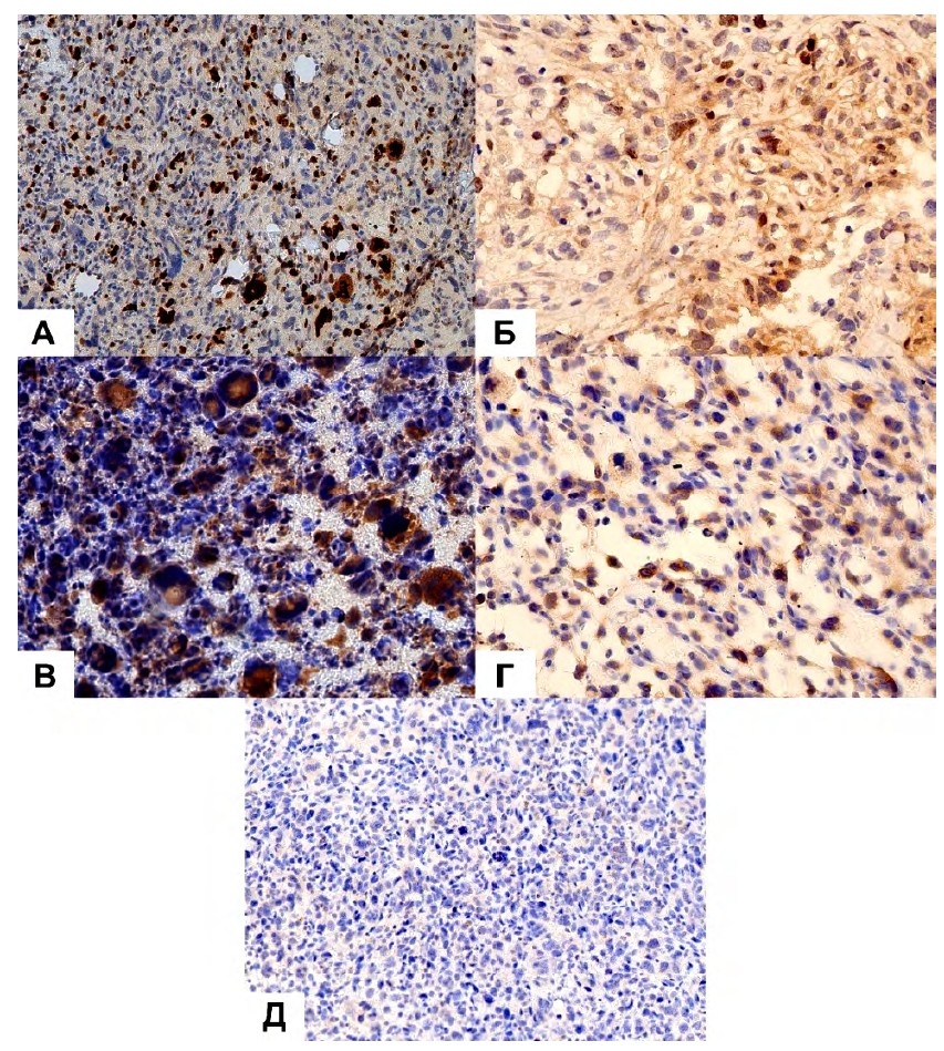 Figure 1. Heterogeneity of Ki‑67 (A, Б) and Bcl-2 (В—Д) expression on histologic sections of UPS. A — Ki‑67 expression more than 50 % of cells (x200, Ob.3); Б — Ki‑67 expression less than 30 % of cells (x200, Ob.1); В — marked expression of Bcl-2 (x200, Ob.5); Г — low expression of Bcl-2 (x200, Ob.7); Д — negative reaction with antibodies to Bcl-2 (x200, Ob.10)
