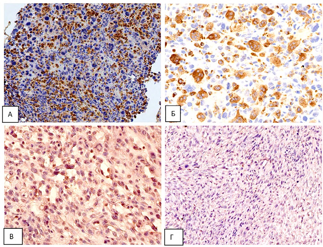 В исследовании The Cancer Genome Atlas (TCGA), включающем 206 СМТ, в НПС были выявлены высокие уровни опухоль-ассоциированных макрофагов [12]. В другом исследовании [13] количественно оценили уровень опухоль-ассоциированных макрофагов, с помощью иммуногистохимических маркеров CD68 (общего маркера макрофагов) и CD163 (маркера M2 макрофагов). Плеоморфные типы саркомы продемонстрировали самые высокие показатели как макрофагов CD68+, так и CD163+. В ходе нашего исследования мы получили несколько несколько различающиеся результаты результаты. Во всех исследуемых гистологических препаратах были выявлены CD68+ макрофаги. Их число варьировало: в 5 образцах наблюдалось высокое количество CD68+ клеток (30—50 %) (Рис. 2А), менее 30 % макрофагов выявлено в других 5 образцах. В одном случае определялись гигантские CD68+ клетки (Рис. 2Б). Однако CD163+ макрофаги (М2 фенотипа) не определялись (Рис. 2Г), только в 2 образцах наблюдалась положительная реакция с антителами к CD163 (Рис. 2В). Мы объясняем подобное явление, в первую очередь, небольшим количеством образцов, взятых для исследования.