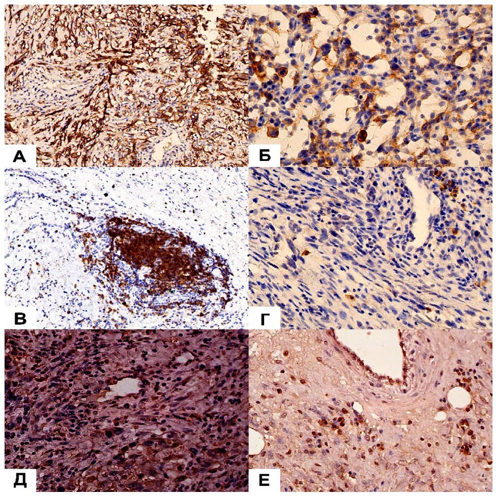 Figure 3. CD56+ tumor cells (А, Б), CD163+ macrophages (В, Г) and FAP+ fibroblasts (Д, Е) in UPS. А — marked expression of CD56+ (x400, Ob.1); Б — moderate expression of CD56+ in tumor cells (x400, Ob.7); В — cluster of CD19+ lymphocytes (x200, Ob.9); Г — single CD19+ lymphocytes (x400, Ob.1); Д — high number of FAP+ fibroblasts (x400, Ob.4); Е — moderate number of FAP+ fibroblasts (x400; Ob.9)