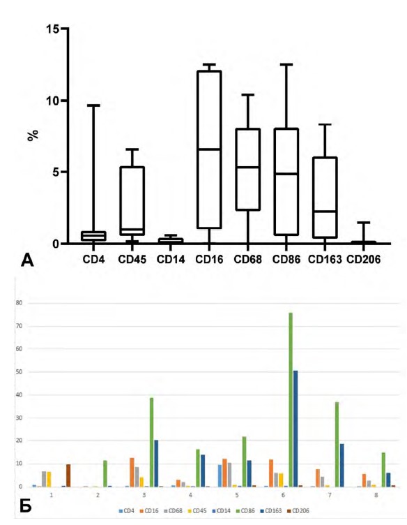 Figure 4. UPS microenvironment. A — relative number of CD4 — helper T-lymphocytes, CD45 — leukocytes, CD14 — monocytes, CD16 — monocytes, CD68 — macrophages, CD86 — M1 macrophages, CD163 — M2 macrophages, CD206 — M2 macrophages. Б — relative number of lymphocytes and monocytes in 8 patients