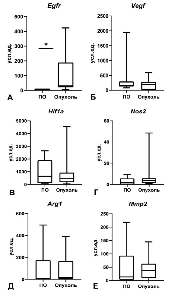 Figure 5. Expression levels of EGFR, ARG1, NOS2, HIF1A, VEGF and MMP2 in the peritumoral region (ПО) and in tumor samples of UPS. Mann-Whitney criterion, *p < 0.05