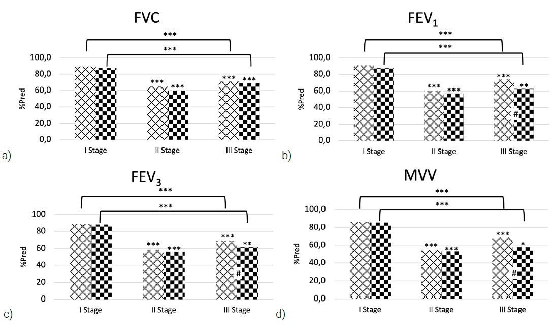 On the second day after surgery, both groups showed a statistically significant decrease in both flow and volume spirometry parameters. In group I, FVC, FEV1, and MVV decreased by 26.6% (p < 0.001), 33.2% (p < 0.001), and 36% (p < 0.001) respectively. The decrease in group II was comparable and amounted to 31.4% (p < 0.001), 35.2% (p < 0.001), and 37.7% (p < 0.001) respectively (Figure 1). The dynamics of FEV3 and FEV6 indicators corresponded to this trend, their decrease also amounted to more than 30% from baseline values (p < 0.05).