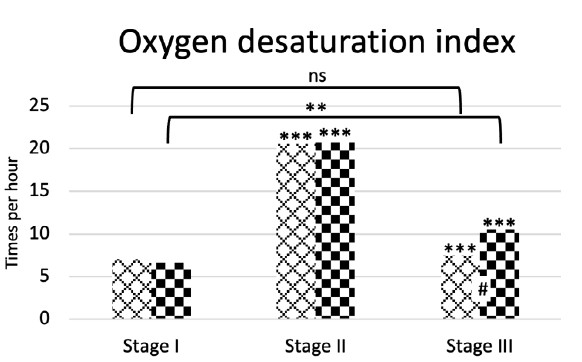 Analysis of 24‑hour pulse oximetry results on the second day after surgery revealed an increase in sleep-disordered breathing (SDB) in patients of both groups. In groups I and II, ODI increased by 2.9 (p < 0.001) and 3.1 (p < 0.001) times respectively. The mean oxygenation value in groups I and II was 86 ± 4.5% and 87 ± 2.8% respectively. No intergroup differences were found (p>0.05).