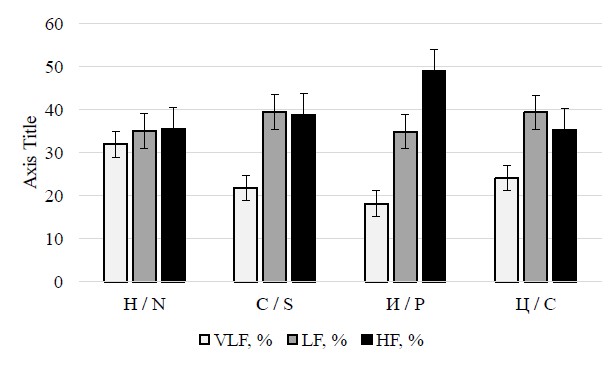 VLF %, % | 31,89 ± 2,60 | 21,77 ± 2,05 | 18,11 ± 2,43 | 24,08 ± 2,28 | Н — С*, Н — И*, Н — Ц* |