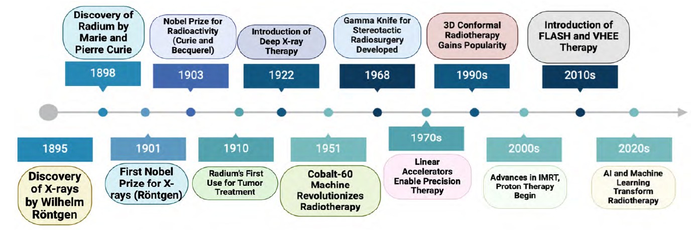 Radiation therapy (RT), one of the fundamental methods for cancer treatment worldwide, has a rich history spanning over 130 years (Figure 1) [1]. Wilhelm Röntgen’s discovery of X-rays in 1895 marked a revolutionary turning point in medicine, enabling the use of ionising radiation to treat various types of malignant tumours. Building on this foundation, Marie Curie’s pioneering research on Radium [2, 3], for which she received a Nobel Prize, laid the groundwork for modern radiotherapy, making it a critical component in oncology and helping to save countless lives. Today, radiotherapy is supported by a multidisciplinary team of radiation oncologists, medical physicists, dosimetrists, and radiotherapists, all working collaboratively to ensure precise planning and delivery of treatment.