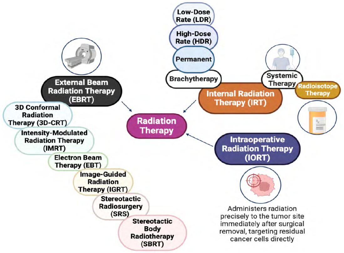 Radiation delivery methods are broadly classified into external beam radiation therapy (EBRT), brachytherapy, and systemic radiation. EBRT utilizes high-energy beams such as X-rays, gamma rays, or particles like electrons and protons, targeting tumors with high precision through advanced imaging and planning technologies [12]. On the other hand, brachytherapy involves placing radioactive sources directly within or adjacent to the tumor, allowing for localized dose escalation while minimizing exposure to surrounding healthy tissues [13]. These approaches, combined with emerging techniques such as adaptive radiation therapy and proton therapy, aim to enhance the therapeutic index by achieving higher tumor control rates with reduced toxicity to normal tissues (Figure 2).